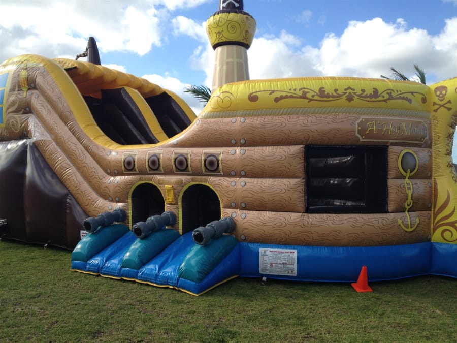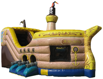 “YAR! ARR! The A'-Hoy Matey™ Slide Combo is set to sail into the hearts and minds of both children and adults alike. This large inflatable will hold about 10 children at a time and provide hours of fun. Complete with Jumping, Climbing, Slide and Obstacles. .. “Ye shall walk the plank" into a fun and adventurous inflatable game.”