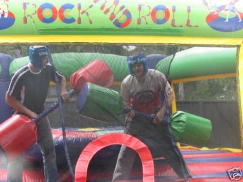 This game turns amateur jousters into rock stars! Players enter the six-sided arena and climb onto the raised center pedestal for a jousting match. There is just enough room on top the pedestal so that players will have to both rock and roll to maintain their balance. A contestant wins when he or she has defeated the opponent and claims the pedestal. Can be used alone as a jumper or with giant poles and head gear.