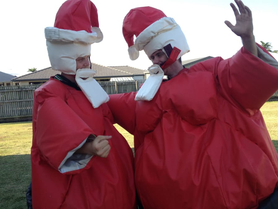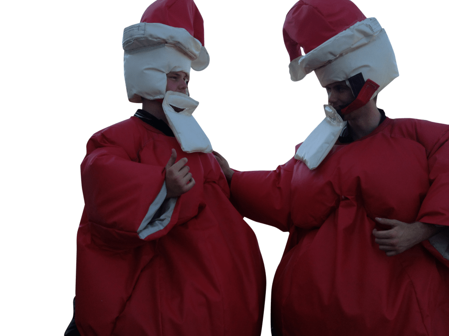 Includes 2 Santa Sumo Suits, 2 Helmets and 4m2 Sumo Wrestling Mat